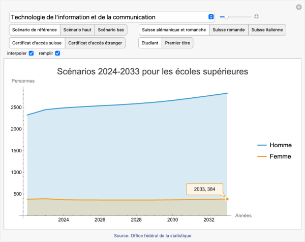Présentation interactive des scénarios 2024-2033 pour les écoles supérieures suisses. Évolution attendue du nombre d’étudiants et de premiers titres selon le scénario, la région linguistique, le domaine de formation, le certificat d’accès et le sexe.
