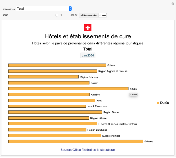 L’Office fédéral de la statistique a publié le 7 mars 2024 les arrivées et nuitées des Hôtels et établissements de cure suisses de 2006 à 2024. La consultation de ces données dans le fichier Excel nécessite de nombreux défilements horizontaux et verticaux. Pour faciliter l’accès à ces données, nous avons développé un outil qui les concentre chaque mois dans le champ visuel. Le menu déroulant permet de choisir le pays de provenance. Le curseur autorise un défilement rapide des dates. Deux boutons permettent de choisir l’affichage des « Nuitées - Arrivées » ou de la « Durée ». Le survol des barres donne les valeurs.