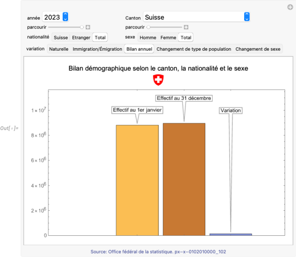 Cet outil permet de consulter aisément les naissances vivantes, les décès et l’accroissement naturel de la population suisse de 1971 à 2023. Il donne aussi l’immigration et l’émigration ainsi que les mouvements cantonaux. L’examen peut se faire en fonction de l’année, du Canton, de la nationalité et du sexe. Un bilan annuel donne l’effectif au premier janvier, au 31 décembre et la variation.