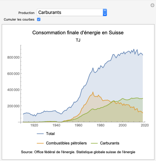 Consommation finale d’énergie, par agent énergétique. Données de l’Office fédéral de l’énergie. Statistique globale suisse de l’énergie.