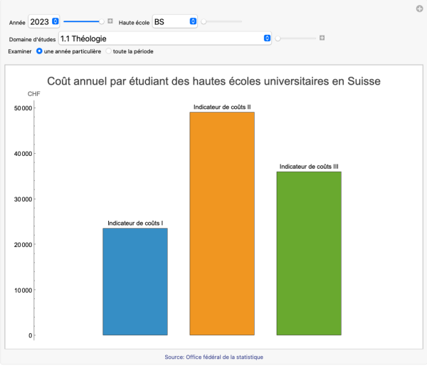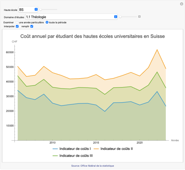 L’outil permet de consulter le coût annuel par étudiant des hautes écoles universitaires suisses pour les différents domaines d’études. La période disponible s’étend de 2006 à 2023. L’évolution des coûts sur cette période est donnée sous forme graphique.
