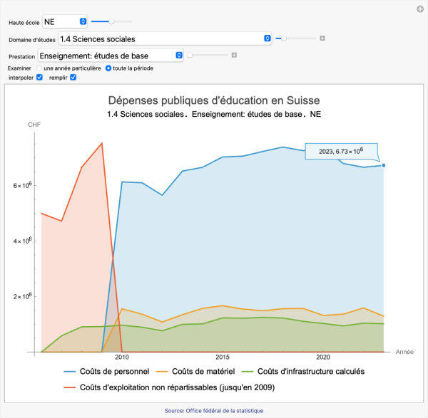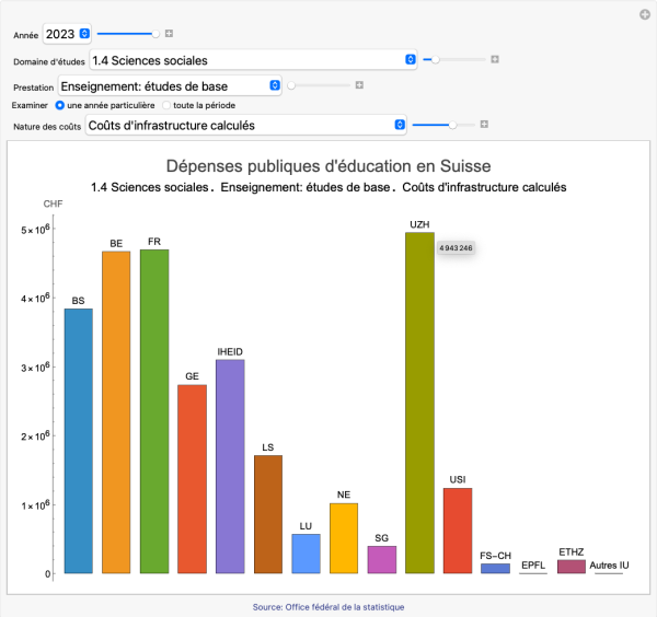 L’outil proposé permet de comparer les dépenses publiques d’éducation en Suisse pour différentes hautes écoles en fonction du domaine d’études et du type de prestation (enseignement : études de base, enseignement : formation approfondie, recherche et développement, formation continue, prestations de services). Les coût sont répartis en coûts de personnel, coûts de matériel et coûts d’infrastructure. L’outil fournit également l’évolution des coûts de 2006 à 2023 par établissement pour chaque domaine d’études.