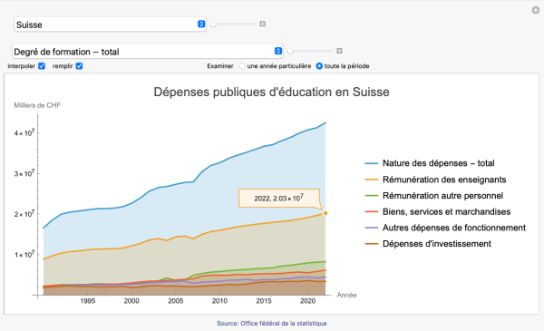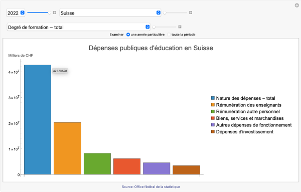 L’outil de consultation donne accès aux dépenses par niveau administratif (Suisse, Confédération, Cantons et concordats ensemble, Communes ensemble, Cantons, concordats et Communes ensemble) selon le degré de formation pour chaque année de 1990 à 2022. Il présente aussi sous forme graphique l’évolution des dépenses pour toute cette période.