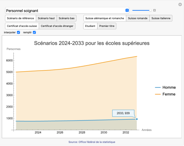 Présentation interactive des scénarios 2024-2033 pour les écoles supérieures suisses. Évolution attendue du nombre d’étudiants et de premiers titres selon le scénario, la région linguistique, le domaine de formation, le certificat d’accès et le sexe.