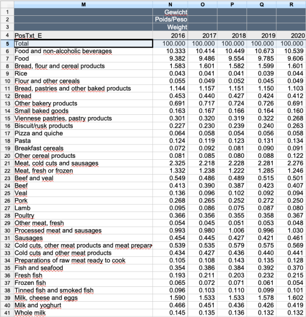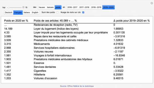 Le fichier Excel publié par l’OFS le 5 janvier 2021 donne l’indice des prix à la consommation en Suisse de janvier 1983 à décembre 2020. Nous proposons un outil d’analyse des données pour les paniers-types de 2016 à 2020.