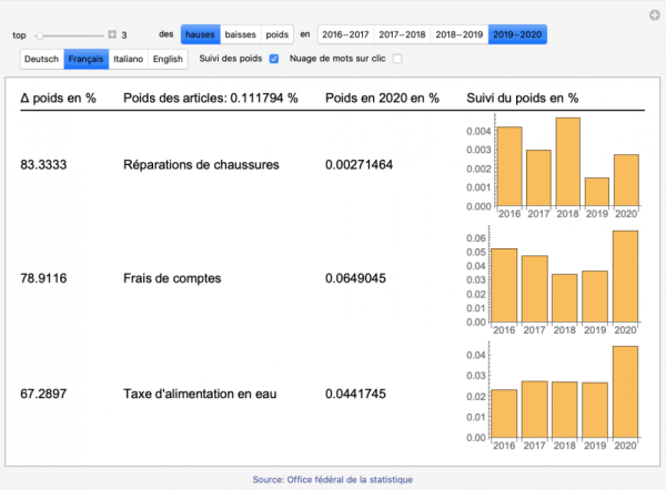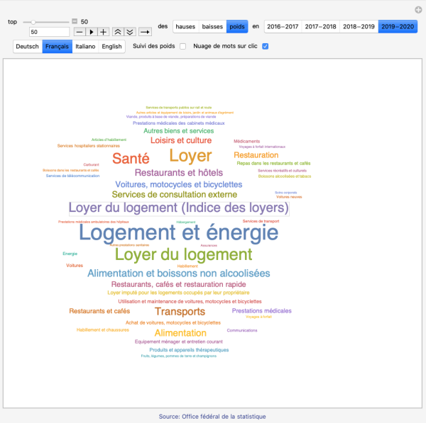 Pour faciliter l’analyse de ces données, nous avons développé une application qui permet de comparer les variations de poids de chaque article d’une année à l’autre en affichant une liste ordonnée selon le taux de variation, ou selon le poids. Les articles peuvent être exprimés dans chacune des langues et sont affichés avec les poids de l’année sélectionnée. Les poids des autres années peuvent être présentés simultanément sous forme graphique. Pour appréhender plus facilement les poids, un nuage de mots dont les tailles renseignent sur le poids peut être obtenu. Le curseur « top »permet de choisir le nombre d’articles à afficher. Les boutons qui le suivent extraient du panier les articles ayant subi les plus fortes variations ou ceux ayant le plus de poids pour une période donnée.