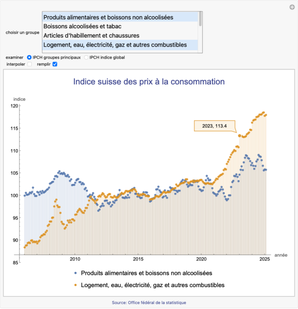 L’évolution de 2006 à 2024 des indices harmonisés pour les groupes principaux est présentée sous forme graphique. Il est possible de choisir un ou plusieurs groupes dans la liste. La présentation de l’indice global est annuelle. Les variations de l’indice en % par rapport au mois précédent ainsi que les variations en % par rapport au même mois de l’année précédente sont également présentées annuellement.