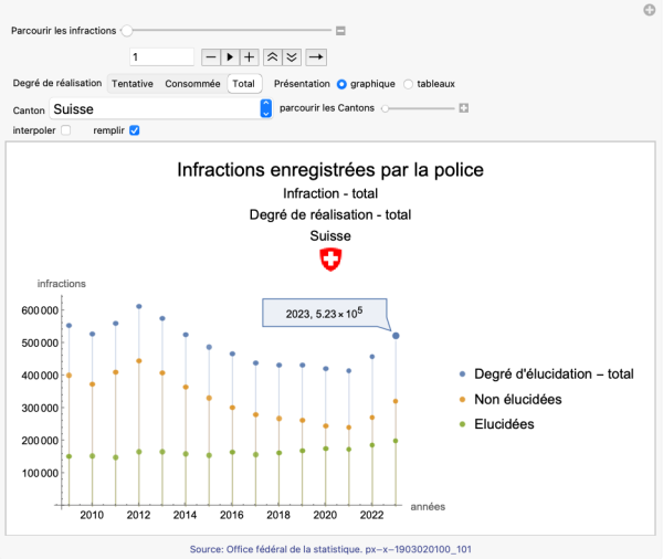 Cet outil permet de consulter les 265 types d’infractions enregistrées par la police dans chaque Canton suisse de 2009 à 2023. Il permet de distinguer le degré de réalisation (tentative ou consommée) et le degré d’élucidation (non élucidée, élucidée) de chaque infraction.