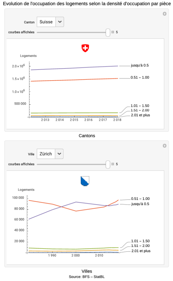 Logements occupés selon la densité d’occupation par pièce, par canton et par ville. Evolution. Période d’observation 2012-2018 pour les cantons. 1980-2018 pour les villes.