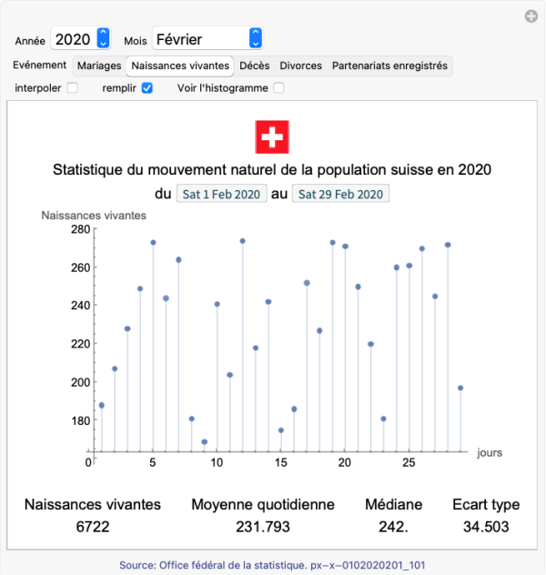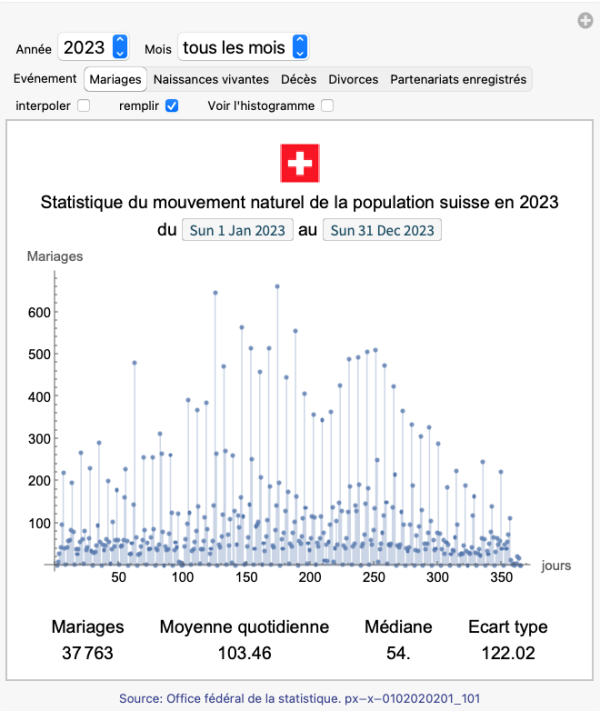 Cet outil permet d’analyser les mouvements naturels de la population suisse (mariages, naissance vivantes, décès, divorces et partenariats enregistrés). Il est possible d’examiner l’évolution annuelle des cas de 1969 à 2023 et l’évolution mensuelle chaque année. Le nombre total de cas et la moyenne sont donnés pour ces deux périodes d’observation.
