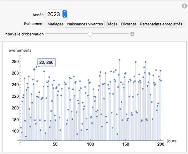Pour palier ces lacunes, nous avons développé un outil qui fournit le nombre d’événements en fonction des dates avec nom du jour. Dans la version locale, téléchargeable en cliquant sur l’image ci-dessous, le survol d’un point donne le numéro du jour et le nombre d’événements. Cette version possède deux curseurs pour définir l’intervalle d’observation. Cet l’intervalle ne comporte pas de lacune et les dates sont données avec le nom du jour. La modification de l’année, du type d’événement ou de l’intervalle d’observation est plus aisée avec cet outil.
