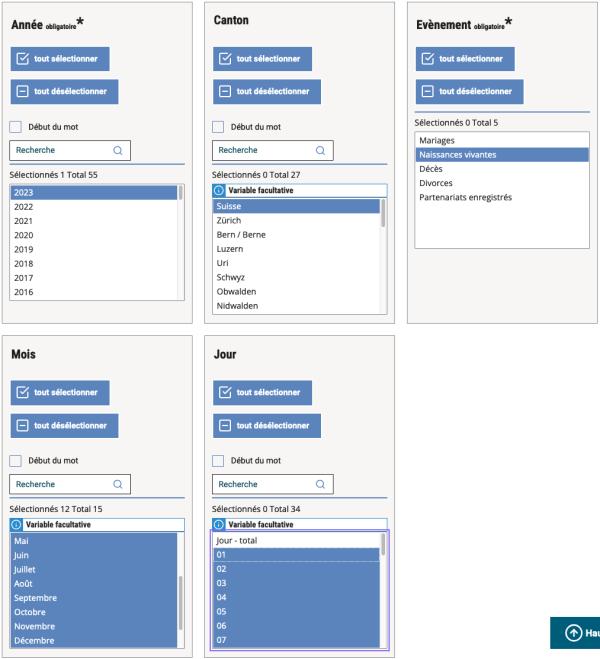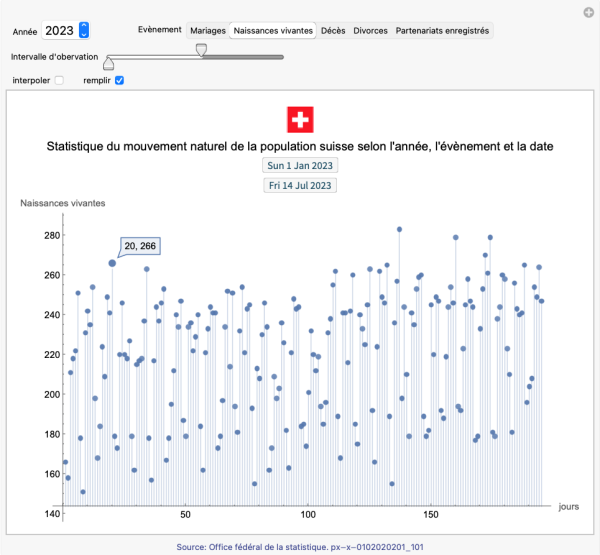 L’outil d’analyse de l’Office Fédéral de la Statistique donne accès au mouvement naturel de la population (naissances vivantes, décès, mariages, partenariats enregistrés, divorces) selon l’année, le mois et le jour de l’évènement, depuis 1969.