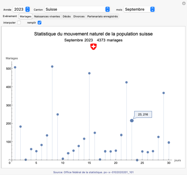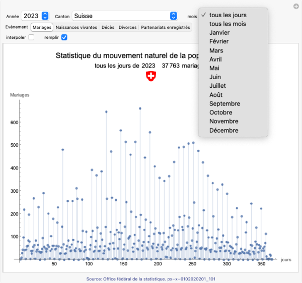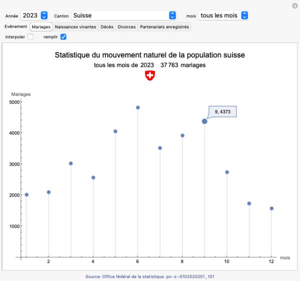 Cet outil donne un accès aisé aux mouvements naturels de la population suisse (mariages, naissance vivantes, décès, divorces et partenariats enregistrés). Il offre la possibilité d’examiner l’évolution quotidienne des cas de 1969 à 2023, selon l’année ou le mois, par Canton. Le nombre total de cas est donné pour chacune de ces périodicités.