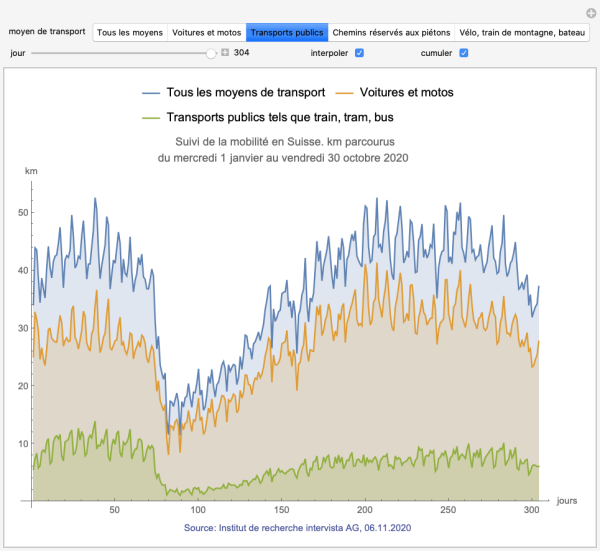 Nous avons utilisé les données du fichier « Modalsplit pro tag » annexé donnant les motifs des déplacements quotidiens effectués par les résidents suisses de janvier à octobre 2020. Pour faciliter l’exploration de ces données, nous avons réalisé une application qui peut être consultée sur WolframCloud.