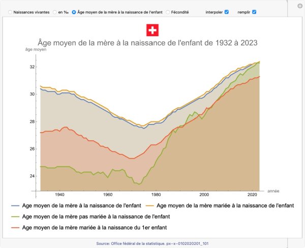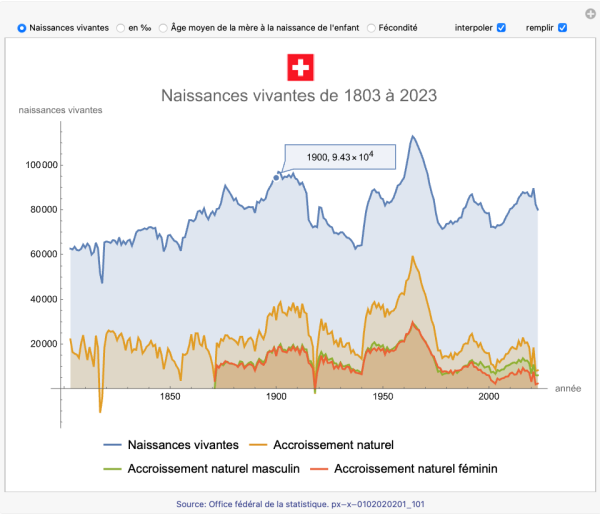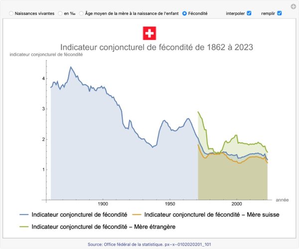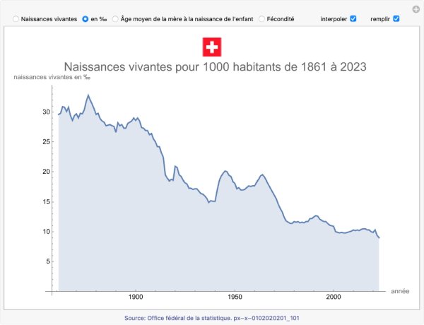 Cet outil donne le nombre de naissances vivante en Suisse, en valeurs et en pour mille, de 1803 à 2023. Il indique l’âge moyen de la mère à la naissance de l’enfant, pour les mères mariées et non mariées. L’indicateur conjoncturel de fécondité peut être consulté de 1861 à 2023 et distingué pour les mères suisses et étrangères de 1971 à 2023.