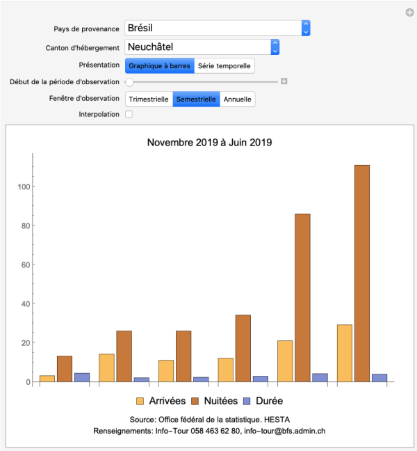 Pour faciliter la comparaison des arrivées et des nuitées au cours du temps, nous avons trié les pays par ordre alphabétique et nous les avons maintenu sur les mêmes lignes pour toute la période d’observation. La fenêtre d’observation permet une comparaison trimestrielle, semestrielle et annuelle pour un pays et un canton donné sur une période de 167 mois. Dans le graphique à barres, le survol des barres donne les nombres correspondants.