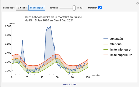 Lors de la deuxième vague de l’épidémie de SRAS-CoV-2, une autre période de surmortalité a été observée entre le 19 octobre 2020 (semaine 43) et le 31 janvier 2021 (semaine 4). Au cours de ces semaines, quelque 8440 personnes de plus qu’attendu (47%) sont mortes dans le groupe des 65 ans et plus et environ 250 personnes de plus (10%) sont mortes parmi les moins de 65 ans. Au cours des semaines 46 à 51 (9.11.-20.12.2020), entre 165% et 170% des décès attendus ont été enregistrés chez les personnes de 65 ans et plus.